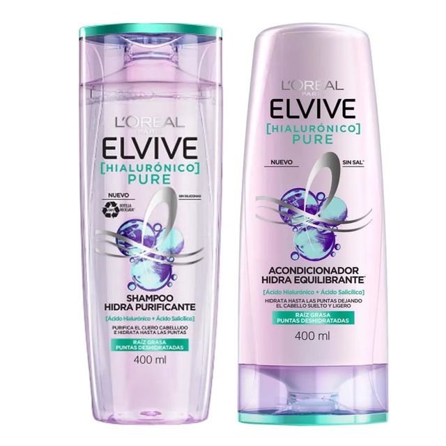 L'OREAL Elvive Puré Hialurónico Shampoo y Acondicionador 400 ml.